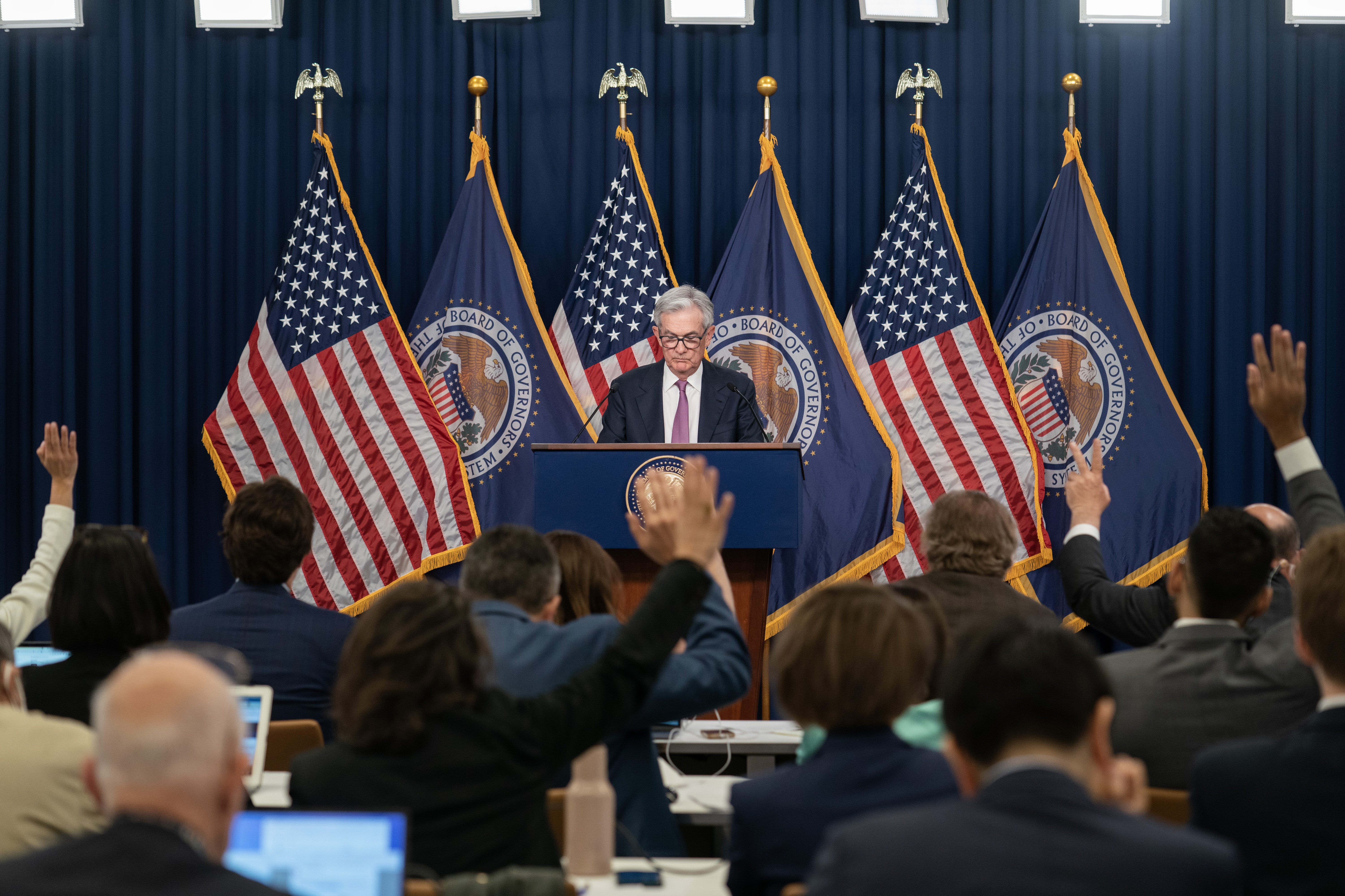 6月14日,好意思国联邦储备委员会主席鲍威尔(后)在华盛顿出席记者会。好意思国联邦储备委员会14日散伙为期两天的货币计策会议,晓示保管5%至5.25%的联邦基金利率缱绻区间不变。(新华社记者刘杰摄)
